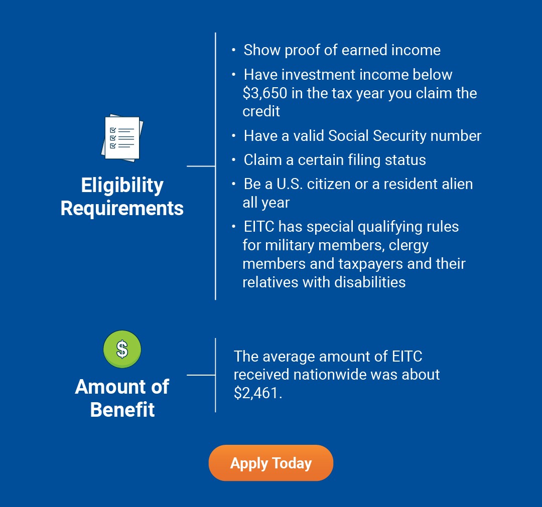 Earned Income Tax Credit (EITC) helps low- to moderate-income workers and families receive a tax break. Check out more info and eligibility requirements below.
